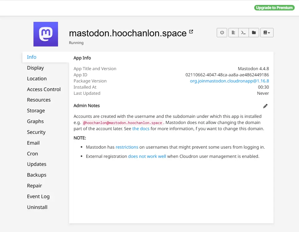 To set yourself as admin, see: https://docs.cloudron.io/packages/mastodon/ -
