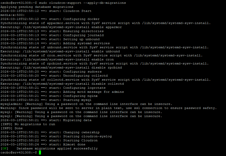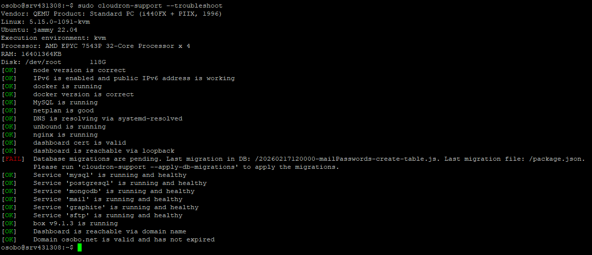Running cloudron-support --troubleshoot returns a migration database issue.